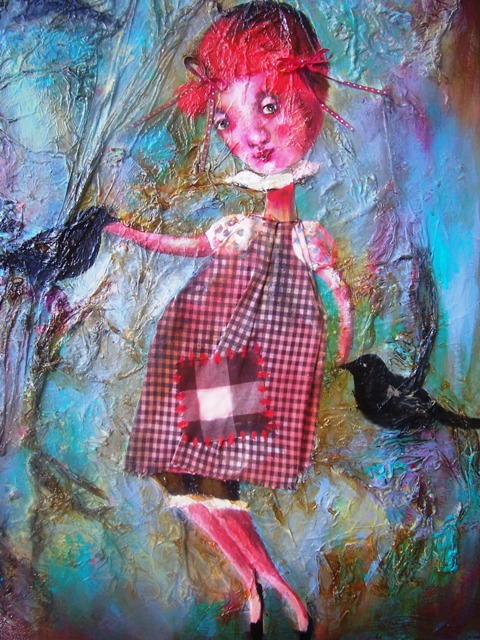 A heavily textured painting using multi-media. Paint, fabric, oil, stix shellac and tissue. Cute-as-a-button pik!