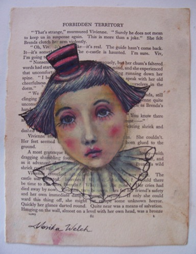 Thi is only a small experiment, and is painted in watercolour crayons,(which incidentally came out like oils) on the page of an old book entitled,"Bumper book for girls". The book has lots of words in the stories like'chum' and 'gosh'. Very cool! I then pasted the pik to a piece of watercolour paper. It comes complete with finger smudges and all! Tis handsigned . All up measures 23cm X 30.5cm