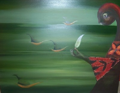 This is a stunning deep green colour (my favourite colour is green by the way) that represents a god-like figure lighting the way for all the boats in the Pacific.....with a white feather. I was going to call this Pacific Lighthouse, but well, changed my mind. I really like this one. Looks stunning on a feature coloured wall. Don't mind the photo, I took it standing up looking down.